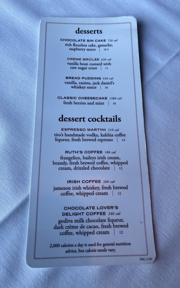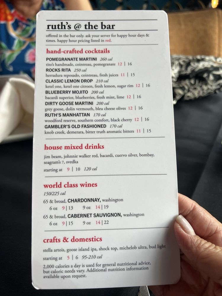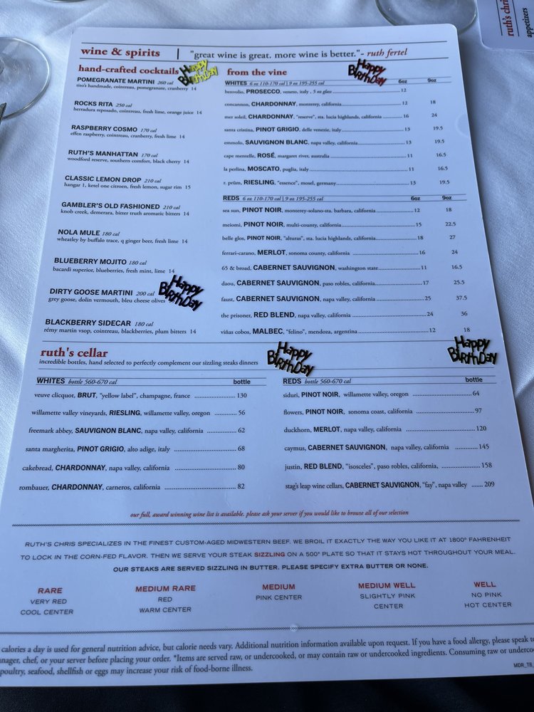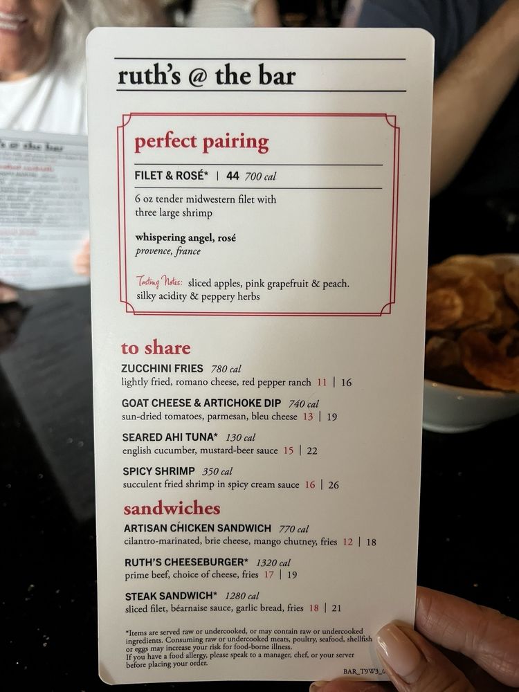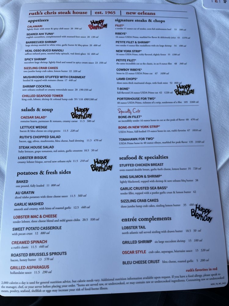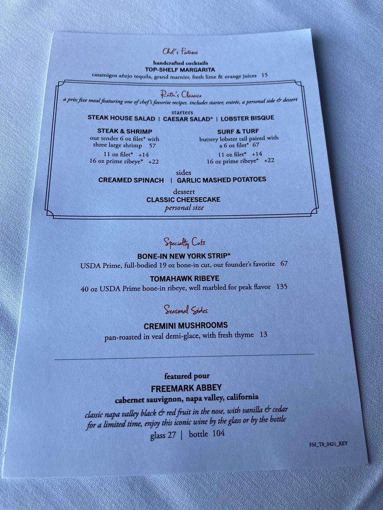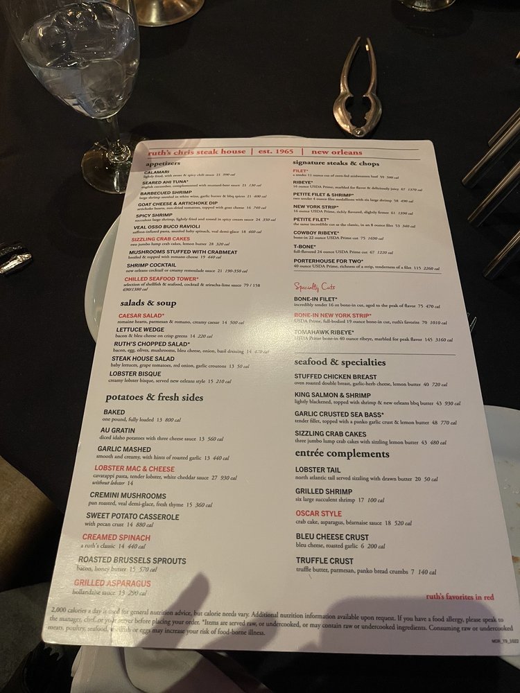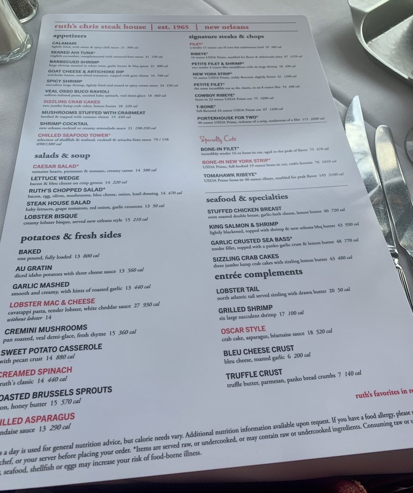 The menu features an array of delectable offerings, from Barbequed Shrimp sautéed in garlic butter to Seared Ahi Tuna paired with mustard-beer sauce. Salads like the Ruth's Chop Salad and Lobster Bisque provide delightful starters, while indulgent desserts like Chocolate Sin Cake conclude your meal perfectly.